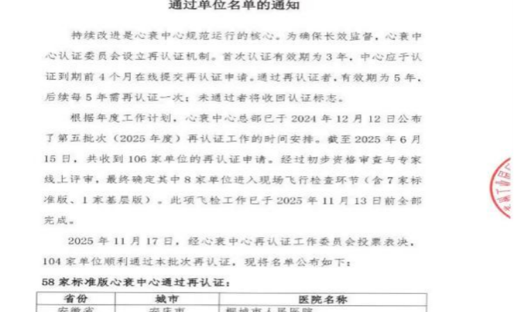 此次再认证历经中国心血管健康联盟等权威机构的严格审核,从基本资质、规范诊疗、培训教育、持续改进四大维度对中心工作进行全面评估。评审专家对我院心衰中心的分级诊疗模式、医联体协同机制及患者教育成效给予高度肯定——中心通过搭建“核心医院+基层网络”的区域协同平台,与9家网络医院建立双向转诊通道,实现了心衰患者急性期快速救治与稳定期规范管理的无缝衔接,累计服务区域内心衰患者万余人次。